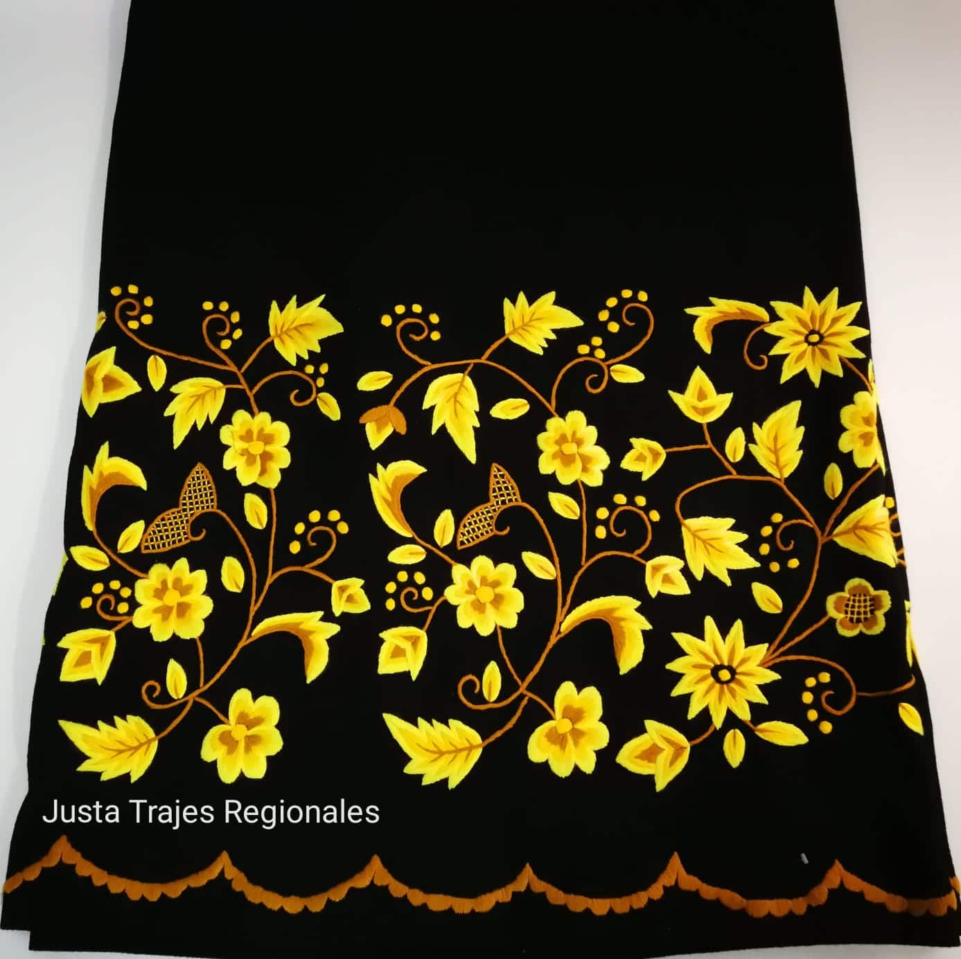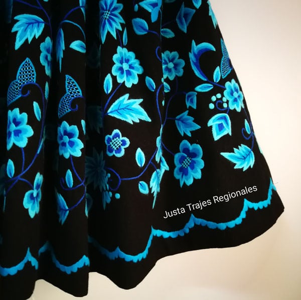 Refajo de 3 metros de vuelo (excepto la variación «Negro en Colores» que también tiene de 3,75 metros de vuelo), bordado a mano en lana. Dibujo muy antiguo. Es un refajo muy murciano y lleno de bordado. Lleva muchas horas de trabajo. Una joya para toda la vida, muy elegante.